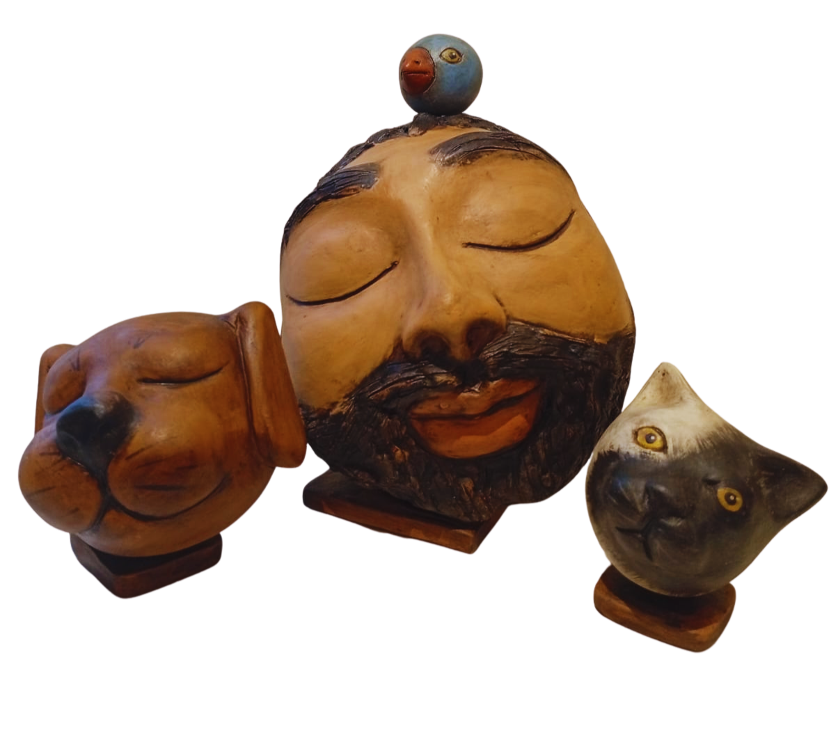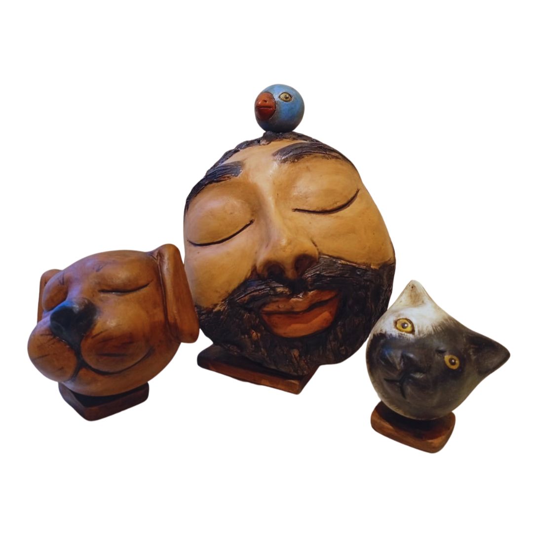 A escultura: Cabeça São Francisco e animais é um objeto decorativo feito de cerâmica. É caracterizado por sua decoração simples e elegante, que geralmente é composta por linhas curvas e formas geométricas, é uma peça versátil que pode ser usada em diferentes ambientes, como salas, quartos, escritórios e áreas externas. As técnicas tradicionais de cerâmica utilizadas foram: a modelagem, o torneamento e a pintura.