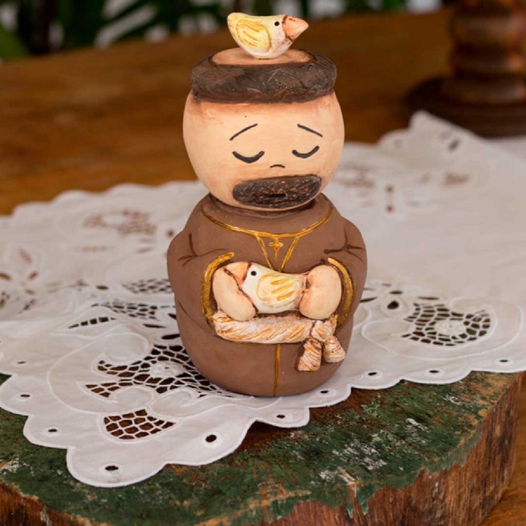 Santo Francisco feito a mão em cerâmica pela artesã Jaqueline Di Girolamo.